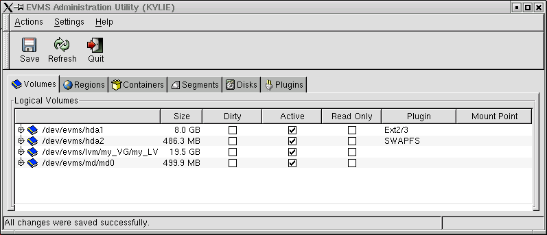 If you are using the EVMS GUI as your preferred interface, you can view your migrated volumes by typing evmsgui at the command prompt. The following window opens, listing your migrated volumes.