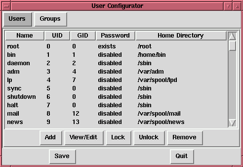 The tool shown in Figure 22 manages the users and groups on your system. In a sense, it is a graphical editor for /etc/passwd and /etc/group, and for /etc/shadow if you have enabled shadow passwords. With this tool you can add and remove users and groups, set login shells, full names, home directories, uid, gids, etc.