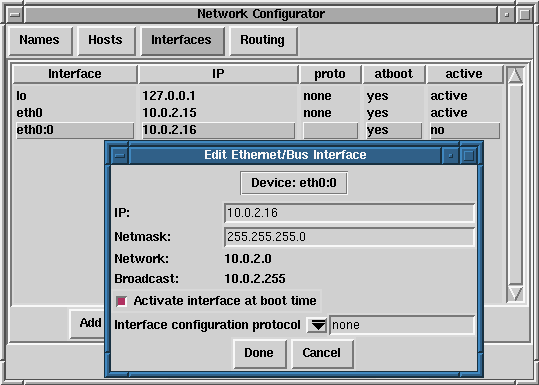 The network configuration tool (netcfg) shown in Figure 32 is designed to allow easy manipulation of parameters such as IP address, gateway address, and network address, as well as name servers and /etc/hosts.